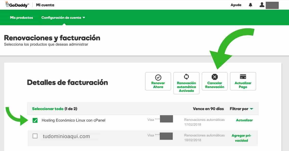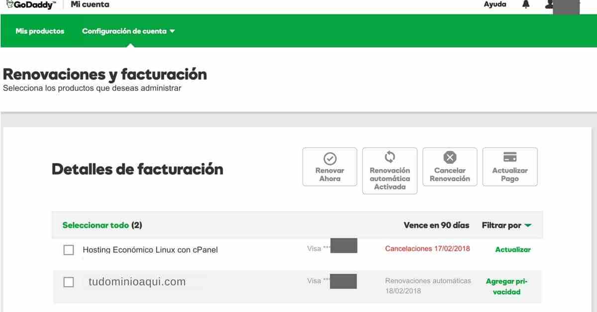 Espero que no tengas que cancelar el servicio y si lo vas a hacer, que sea porque vas a cambiarte a un hospedaje de mucha más capacidad porque el actual no aguanta la cantidad de visitas y ventas que estés teniendo. Pero si decides cancelar, sólo debes ingresar a tu cuenta en GoDaddy y buscar la opción “Configuración de cuenta” o “Renovaciones y facturación”. Seleccionas el producto a cancelar, y click en “Cancelar renovación”.