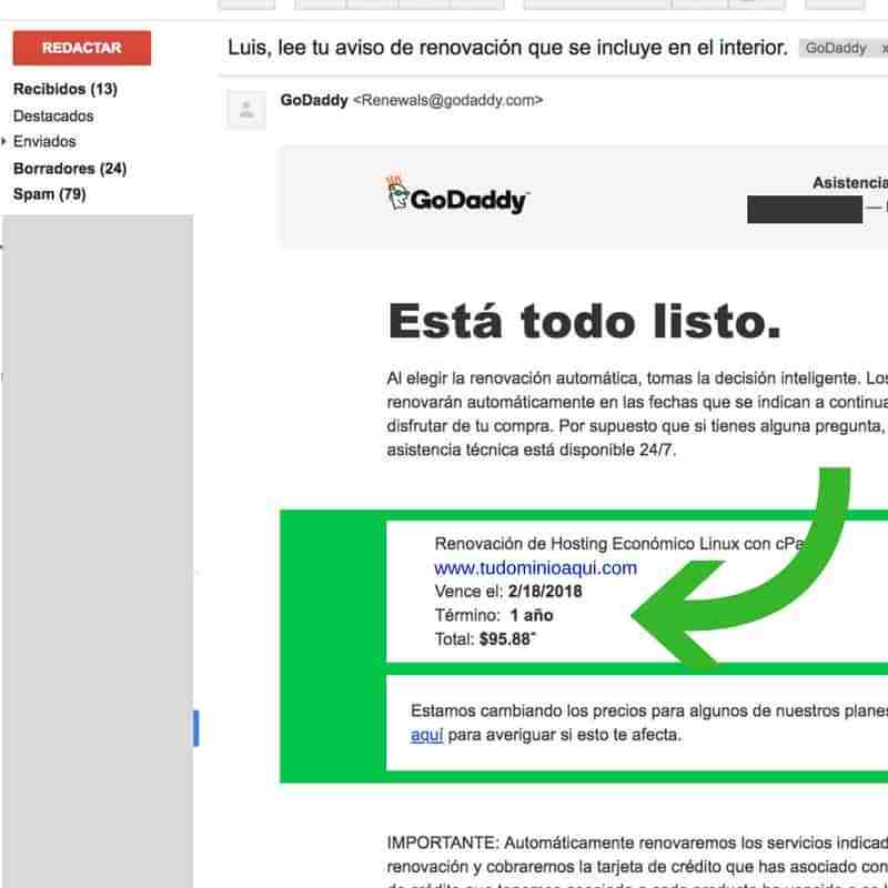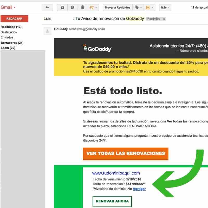 Por ejemplo… Vas a recibir correos electrónicos desde GoDaddy recordando que ya viene la renovación en unos días. Este es un correo electrónico recordando la renovación del dominio